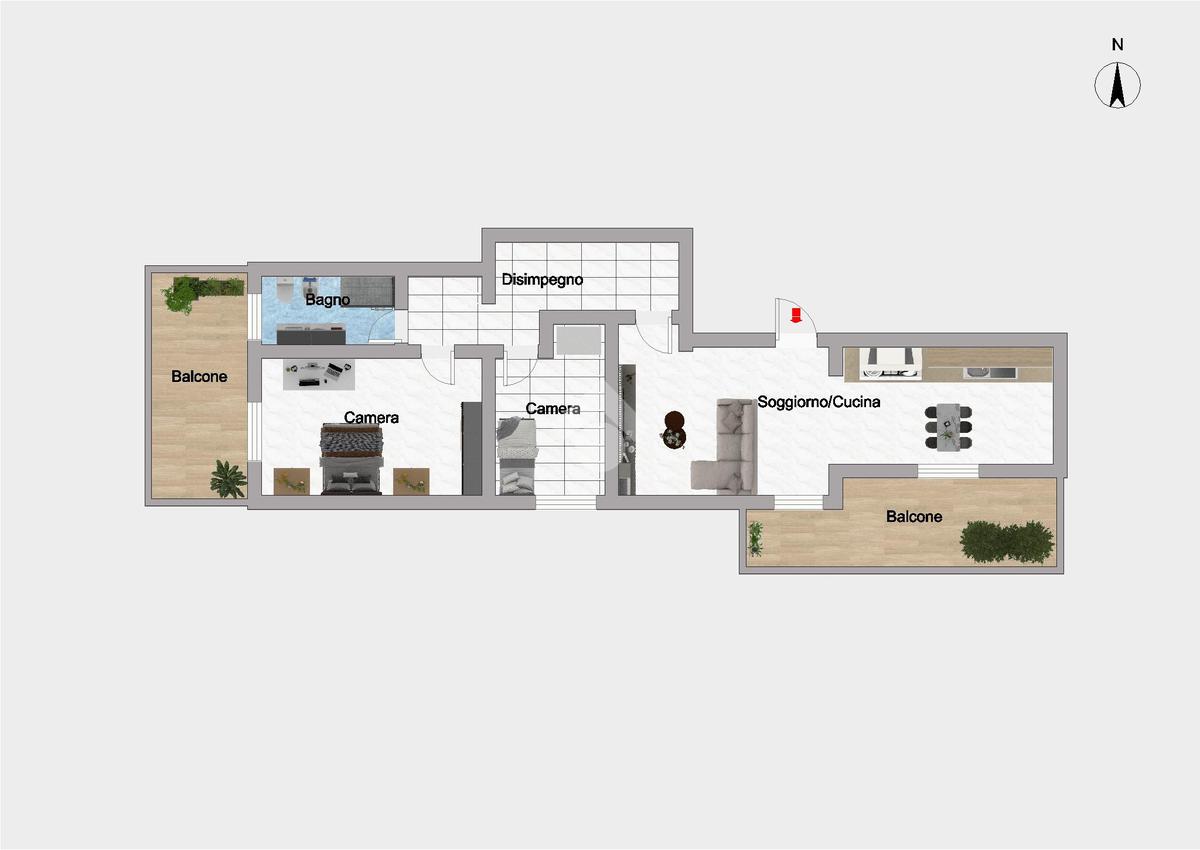 L'ingresso si apre su un'accogliente zona giorno con cucina a vista e accesso diretto al terrazzino. La zona notte comprende la camera da letto matrimoniale, uno studio da adibire a cameretta e il bagno finestrato con doccia e attacco lavatrice.